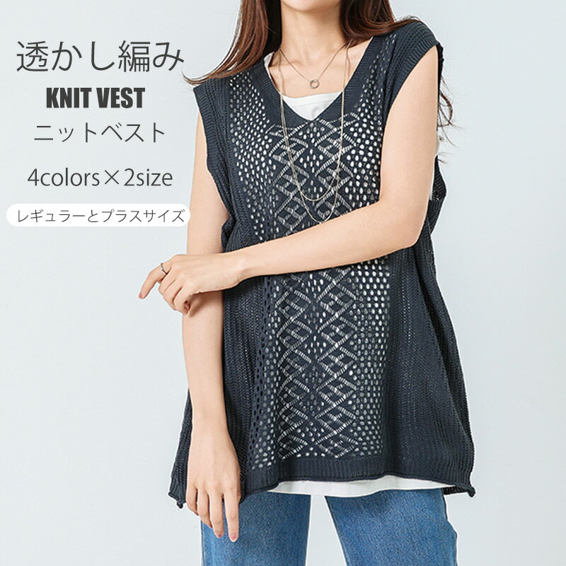 大人気のニットベスト! 軽くて柔らかなニットを使用、楽に着れる一枚。 透かし編みで軽やかで風通し良く、春から秋まで長く着られるデザイン。 ベーシックの4色と2サイズ展開。お好みのフィット感で選べます。 一枚あるだけでコーデの幅が広がる、機能性とトレンド性を兼ね備えた一枚です。 【商品情報】 ■サイズ(cm) 表示サイズ:レギュラー/プラスサイズ バスト:110/118cm 肩幅:40/44cm 総長:65/70cm ■備考 【素材】100%ポリエステル 【裏地】なし 【透け感】あり 【伸縮性】少しあり ※寸法は手測りなので若干誤差がございますが、ご了承くださいませ。 ※お品物の色合いは、写真撮影、パソコン画面表示等の環境の違いにより、若干異なる場合がございますので予めご了承くださいませ。