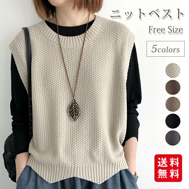 ニットベスト レディース トップス ニット レイヤード 重ね着 春秋 無地 体型カバー シンプル カジュアル クールネック 着回し