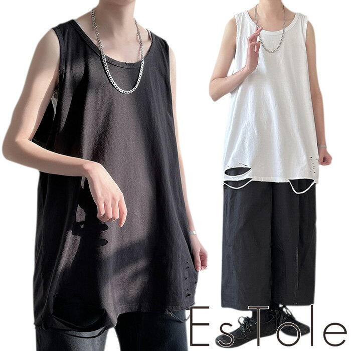 【送料無料】EsTole ダメージタンクトップ ノースリーブ ダメージ加工 ダメージタンク 重ね着 レイヤード 無地 ゆったり オバーサイズ カットソー トップス シンプル ロック パンク モード ストリート系 メンズ モード系 ストリート系系 個性的 原宿系 エストール