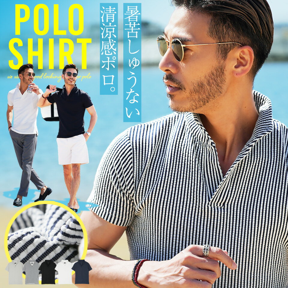 ポロシャツ 半袖 メンズ オシャレ / シアサッカーワイヤー襟スキッパーポロシャツ/ 立ち襟 スリム 細身 服 夏服 春服 サーフ系 無地 リゾート ゴルフ 父の日 プレゼント 父の日ギフト