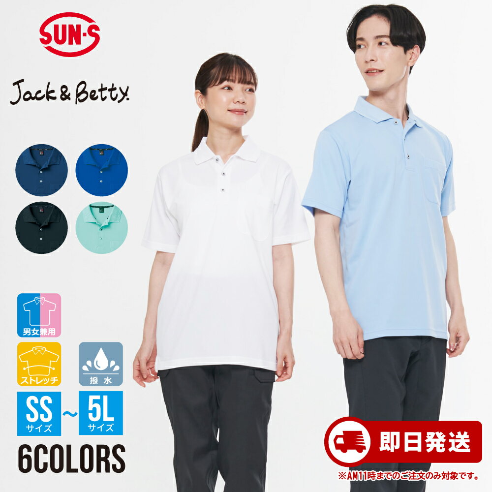 《ブランド紹介》Jack&Betty誰もが自然と笑顔になれる"ハートフルウェア"動きやすさと快適性を実現する機能、清潔を保ち心地よく過ごせる素材、計算されたデザイン性。働く人の体も心もやさしく包むJack&Bettyのユニフォーム。《商品説明》撥水層と吸水拡散層によって、汗ジミが目立たず、これまでにない快適な着心地を提供する半袖ポロシャツ。《素材/カラー展開/サイズ》素材:ポリエステル100%カラー:ネイビー、ブルー、ブラック、ホワイト、サックス、パステルグリーンサイズ:SS、M、L、LL、3L、4L、5L※XL→3Lに移行中のため、ご注文時のサイズと、届いた商品の表記が違う場合がございます。商品の仕様や寸法に違いはございませんので、予めご了承ください。《仕様説明》吸水速乾性の裏地により、通気性が高く蒸れにくい構造になっています。また、汗ジミ防止機能により、従来品よりも汗ジミが目立ちにくくなっています。撥水効果のあるポリエステル糸を使用しており、表面が水を弾くため、ユニフォームが濡れにくく快適な着心地を保てます。《商品備考》※送料無料対象商品※配送時間指定対応可能※モデル画像は環境光の影響によりカラーが実物と異なって見える場合がございます。 平置きのカラー画像を御参考ください。※サイズは平置き、メジャー採寸のため多少誤差が生じる場合がございます。※海外素材のため、色ぶれ・縮み・濃色での色落ちをすることがあります。※濃色の商品に関しましては、変色を防止するため長時間濡れたまま放置しないようにしていただき、干される場合は陰干し若しくは裏返して干していただきますようお願いいたします。