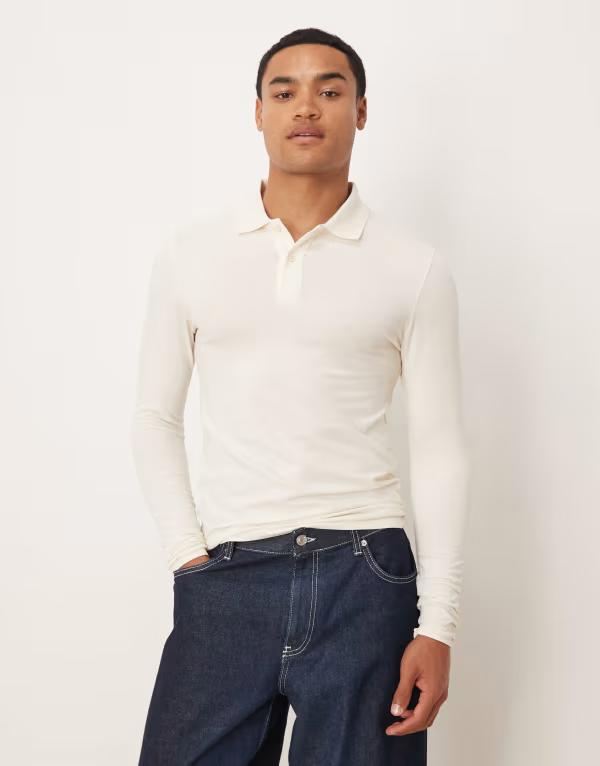 エイソス メンズ トップス ポロシャツ ASOS DESIGN Essentials muscle fit long sleeve polo in cream Coconut milk クリーム