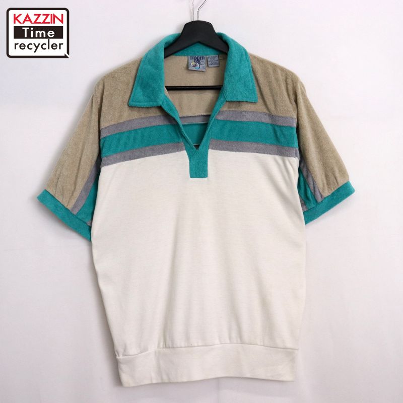 【中古】80s ヴィンテージ スキッパー パイル 半袖ポロシャツ 古着 メンズ 表記Lサイズ ホワイト・ターコイズブルー