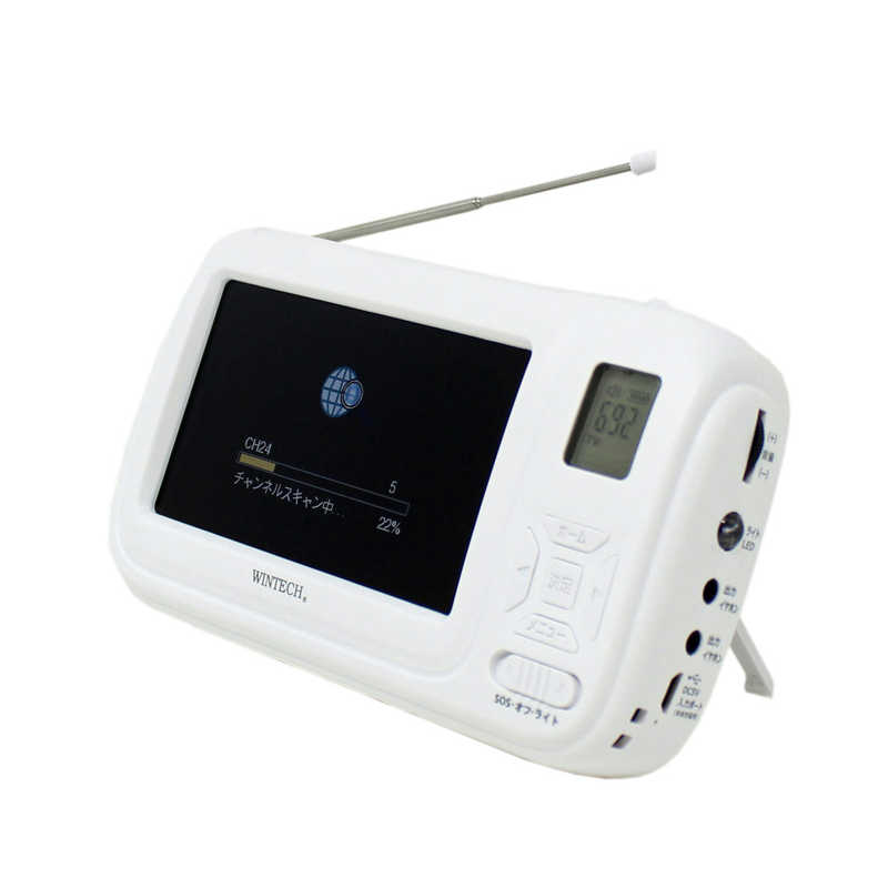 非常時でも活躍!いざ!という時の手回し充電対応!! 4.3インチのカラー液晶を搭載しており、気軽にワンセグTV放送が楽しめます。ワンセグTV録画機能も搭載!(Micro SDカード※別売)。手回しで充電ができるので、いざ!という時にも便利です。AM/FMラジオ・SOSサイレン・LEDライトを搭載し、充実の防災機能で活躍します。 ・4.3インチカラー液晶TV ・ワンセグ視聴・FM・AM ・TV録画機能付き 別途MicroSD ・伸縮ロッドアンテナ ・非常用LEDライト ・SOSサイレン機能 ・乾電池単3×3本(別売) ・充電池内蔵・USB給電 ●商品名:録画機能搭載4.3インチ液晶(手回し充電対応)ポータブルワンセグテレビラジオ ●カラー:ホワイト ●サイズ(約):W156×D38×H89.5mm ●重量(約):295g ●電源:単3形乾電池×3本(別売)、リチウム3.7V 2000mAh、MicroUSB IN 5V/1A端子(給電・充電用)、手回し充電 ●スピーカー音声出力:1W 8Ω ●消費電力(約):1W ●ラジオ:AM(522〜1701KHz)・FM(76〜108MHz)※FMワイドバンド対応 ●付属品:取扱説明書(保証書)、MicroUSBケーブル、USBACアダプター