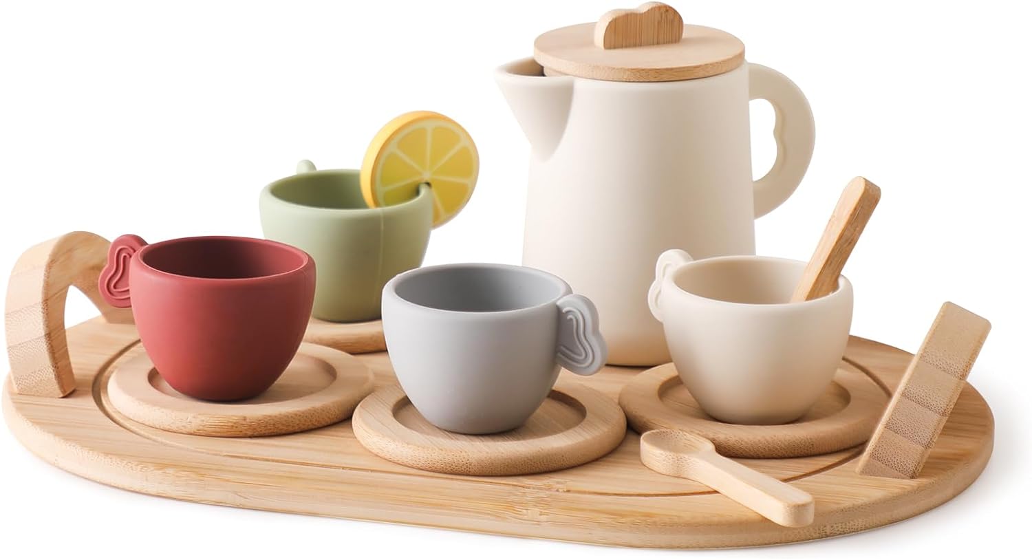 【安心・安全】お子さまの健康と安全のために、アフタヌーンティーセットには天然木と柔らかいシリコンを使用しています。絶妙な仕上がり、角が丸くて、ケガをする心配がなく小さな子供も安心に遊べます。 【豪華なおままごとセット】たくさん含めている食器セットを遊べます。4つのソーサー付きティーカップ、1つのティーポット(フタ付き)、1枚レモンスライス、2本スプーンと食器トレイが含まれています。 【知恵おもちゃ・楽しい方法で学ぶ】このおままごとセットは、子どもの認識力や色彩感覚を養い、想像力や創造力を育み、コミュニケーション能力や表現力を向上させることができます。子どもたちは遊びながら、友だちやパパ・ママとの関係を深めながら、自分の能力を育てていきます。 【楽しい時間を一緒に】子どもたちが自主的に遊べるおままごとセットです。 小さなお子様と一緒にアフタヌーンティー・パーティーをしたり、一緒におしゃべりしたり、遊んだり、楽しいリラックスタイムを過ごすことができます。誕生日、クリスマス、新年、出産祝い、入園祝いや入学祝いなど、お子様へのプレゼントにおすすめです。男女を問わず幼児受けの良い玩具なので、孫にプレゼントもオススメです。