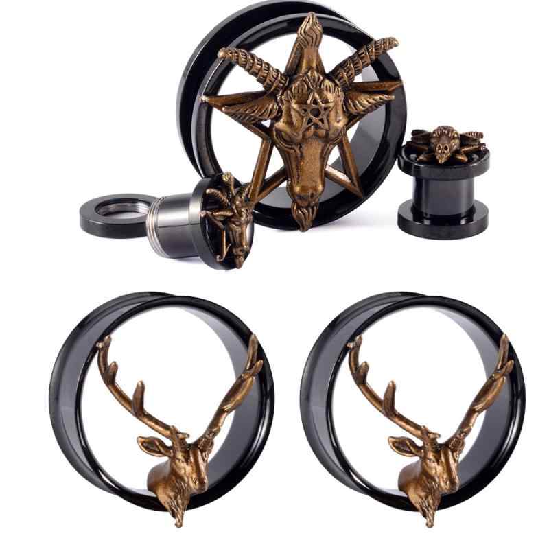 ボディピアス 拡張器 メンズ レディース 男女兼用 サージカルステンレス アレルギー対応 ブラック ゴールド 電気メッキ加工 鹿角 羊頭 六芒星 モチーフ フレアトンネル プラグ(x2)