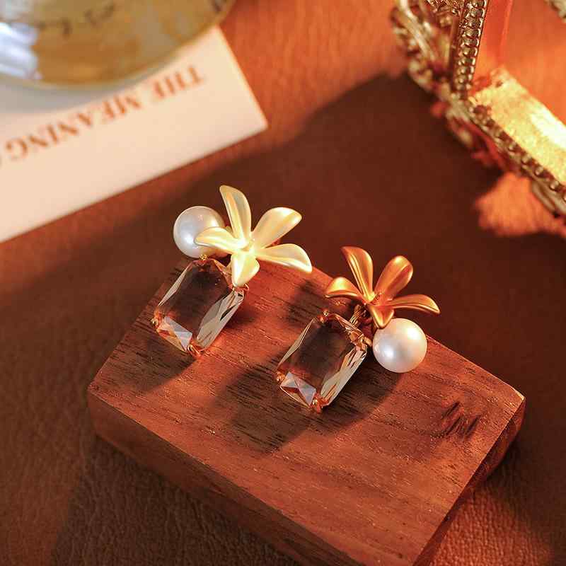ピアス レディース 女性用 ジルコニア シャンパンカラー フラワーモチーフ 真金電気メッキ シルバーポスト 銅合金製 スタッド ドロップ 日韓風 フェミニン 上品 高級感 個性的