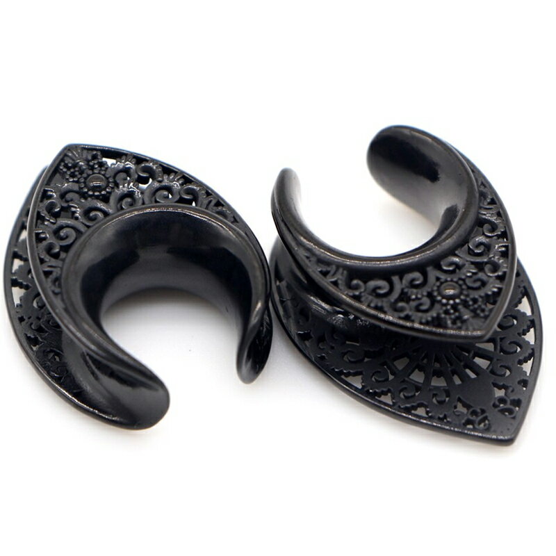 黒色にブラックメッキしたステンレス製の透かしが綺麗な涙型(ティアドロップ)のレリーフに馬蹄型のハーフフレア型のボディピアス。三日月型とも半月型をも言われるおしゃれなダブルフレア型ボディーピアス。ボヘミアンなデザインのステンレス製ボディピアス。ユニークで面白いデザインのボディピアスは存在感もありまくり。装着する向きにもこだわりたいボディピアス。メンズでもレディースでも使えるおしゃれなボディーピアスはペアルックやプレゼントにも。男の人からも女の人からも人気のボディピアスになること間違いなし。ギフトにも使えます。サイズは0G、00G、、12mm、14mm、16mmから通販できます。 スペック0ゲージ(8mm)/ 00ゲージ(10mm)/ 12mm / 14mm / 16mm長さ(有効軸長):約7mm※ゲージサイズは真ん中の細い部分。素材ステンレススティール備考・表示は1ヶの価格です。・写真はイメージです。お客様のモニターにより商品の色やイメージが異なる場合があります。・スペックサイズは目安としての参考値です。多少誤差がある場合がございますので予めご了承ください。