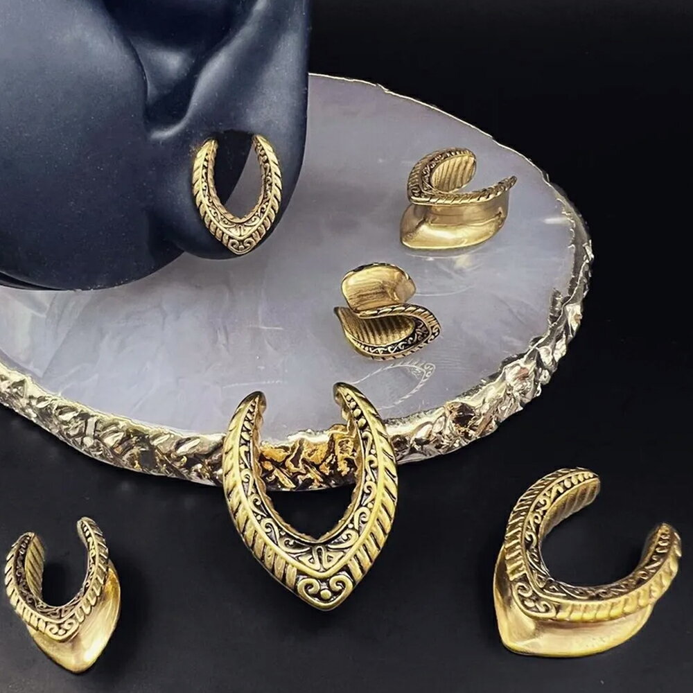 波やハートをデザインした古代エジプトの遺跡に出てきそうなアンティークなデザインの金色ゴールドメッキしたサージカルステンレス316L製の涙型(ティアードロップ)のレリーフに馬蹄型のハーフフレア型のボディピアス。三日月型とも半月型ともいわれるおしゃれなダブルフレア型ボディーピアス。ボヘミアンなデザインのステンレス製ボディピアス。ユニークで面白いデザインのボディピアスは存在感もあり彼氏彼女にもオススメ。ある程度ホールの拡張に余裕のある人向けのボディピアス。素材も全身ステンレスなので、つけっぱなしでも劣化しにくくきれいで安心。装着する向きにもこだわりたいボディピアス。メンズでもレディースでも使えるおしゃれなボディーピアスはペアルックやプレゼントにも。男の人からも女の人からも人気のボディピアスになること間違いなし。ギフトにも使えます。ゲージサイズは0ゲージ(0G)、00ゲージ(00G)、12mm(12ミリ・ハーフインチ)から選べます。[スペック]0ゲージ(5.6mm x 9mm)/ 00ゲージ(8mm x 10.5mm)/ 12mm(9mm x 13mm)長さ(有効軸長):約7mm※ゲージサイズは真ん中の細い部分。()括弧内は幅x高さの数値[素材]サージカルステンレス316L[備考]・表示は1ヶの価格です。写真はイメージです。実際の商品とは多少異なる場合がございます。ハンドメイドの為多少サイズは異なります。
