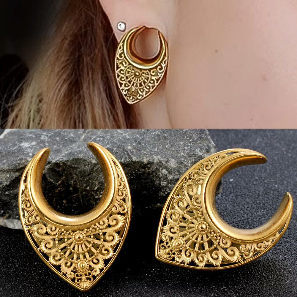 金色にゴールドメッキしたステンレス製の透かしが綺麗な涙型(ティアドロップ)のレリーフに馬蹄型のハーフフレア型のボディピアス。三日月型とも半月型をも言われるおしゃれなダブルフレア型ボディーピアス。ボヘミアンなデザインのステンレス製ボディピアス。ユニークで面白いデザインのボディピアスは存在感もありまくり。装着する向きにもこだわりたいボディピアス。メンズでもレディースでも使えるおしゃれなボディーピアスはペアルックやプレゼントにも。男の人からも女の人からも人気のボディピアスになること間違いなし。ギフトにも使えます。サイズは0G、00G、、12mmから通販できます。[スペック]0ゲージ(8mm)/ 00ゲージ(10mm)/ 12mm 長さ(有効軸長):約7mm※ゲージサイズは真ん中の細い部分。[素材]ステンレススティール表示は1ヶの価格です。写真はイメージです。実際の商品とは多少異なる場合がございます。ハンドメイドの為多少サイズは異なります。