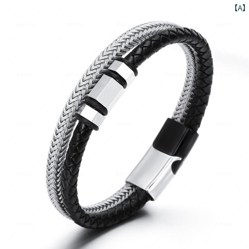 ブレスレット メンズ 男性用 ステンレススチール ワイヤー編み チタン鋼 レザー 革 シンプル マグネット留め具 普段使い カジュアル ビジネス スタイリッシュ バングル ブラック ホワイト