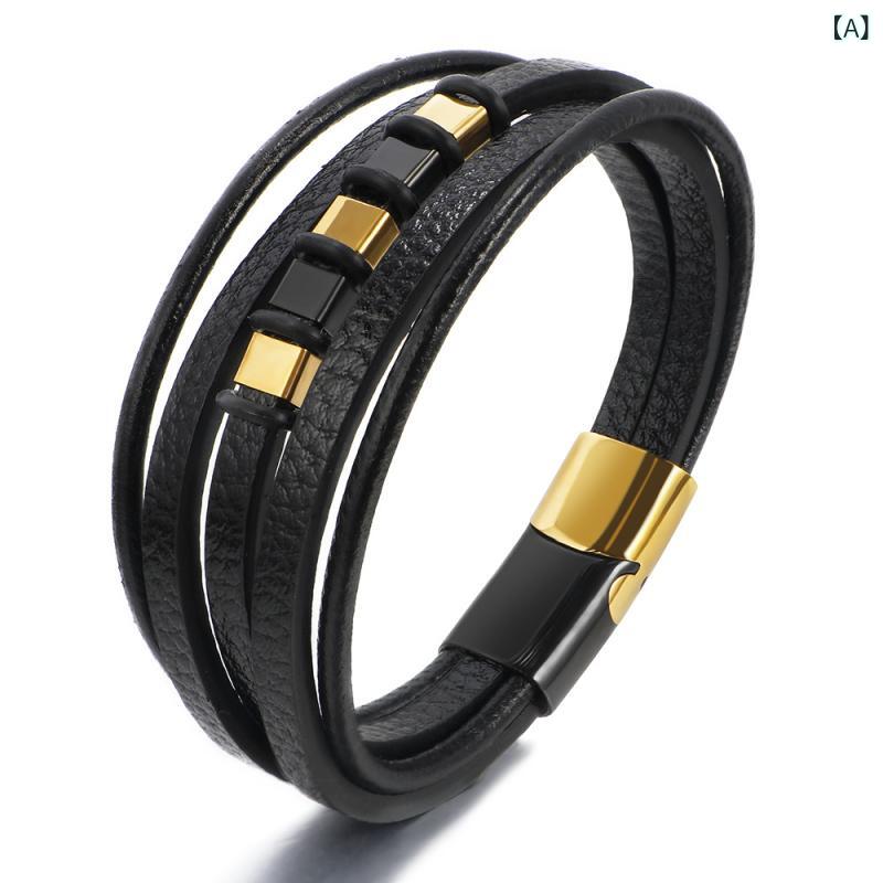 ブレスレット メンズ ステンレス鋼 チタン鋼 レザー 革 編み込み 多層 バングル 欧米風 ファッション おしゃれ 電気メッキ加工 ブラック ゴールド スチール アクセサリー 腕輪