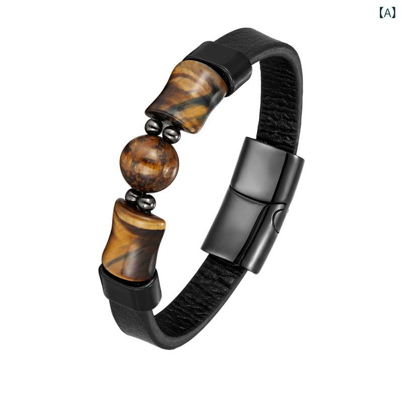 ブレスレット メンズ 本革 レザー ステンレス タイガーアイ 天然石 編み込み デザイン 個性的 おしゃれ 普段使い カジュアル ファッション 腕輪