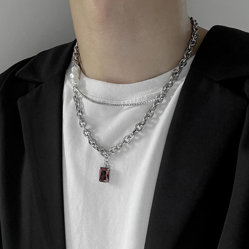 ネックレス メンズ チタン鋼 赤 ルビー パール 人工宝石 二重 チェーン 50cm ペンダント 男女兼用 軽量 シンプル ヒップホップ おしゃれ アクセサリー