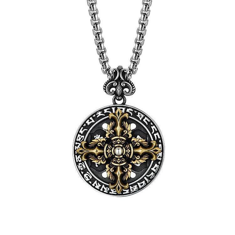 ネックレス メンズ レトロ 六字真言 金剛杵 リング ペンダント 幾何学模様 銅製 電気メッキ加工 パール 麻花 龍骨 チェーン
