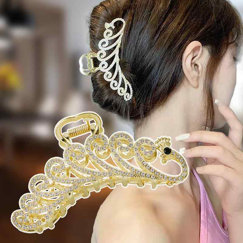 ヘアクリップ レディース 韓国風 大ぶり メタル パール ラインストーン クジャク モチーフ シャーククリップ バンスクリップ まとめ髪 髪飾り