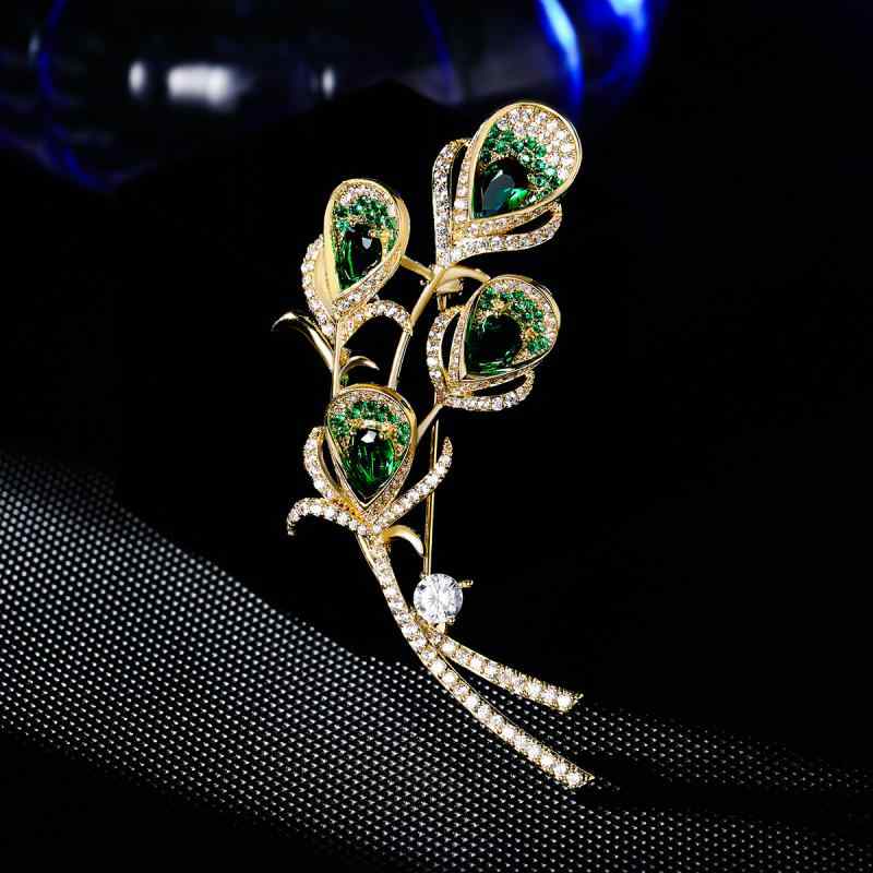 ブローチ レディース 高級感 豪華 エレガント クジャク フェニックス 羽 フェザー エメラルドグリーン 銅製 電気メッキ加工 ファッション通勤 コート用 インフルエンサー 装飾