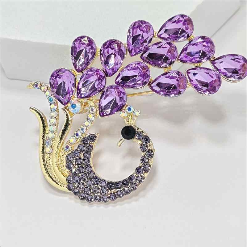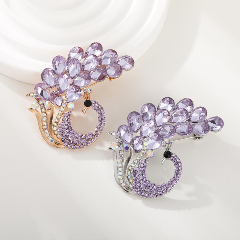 ブローチ レディース クジャクモチーフ 合金製 パープル クリスタル ラインストーン 電気メッキ加工 エレガント 上品 ファッション カジュアル 春夏 アクセサリー ゴールド シルバー