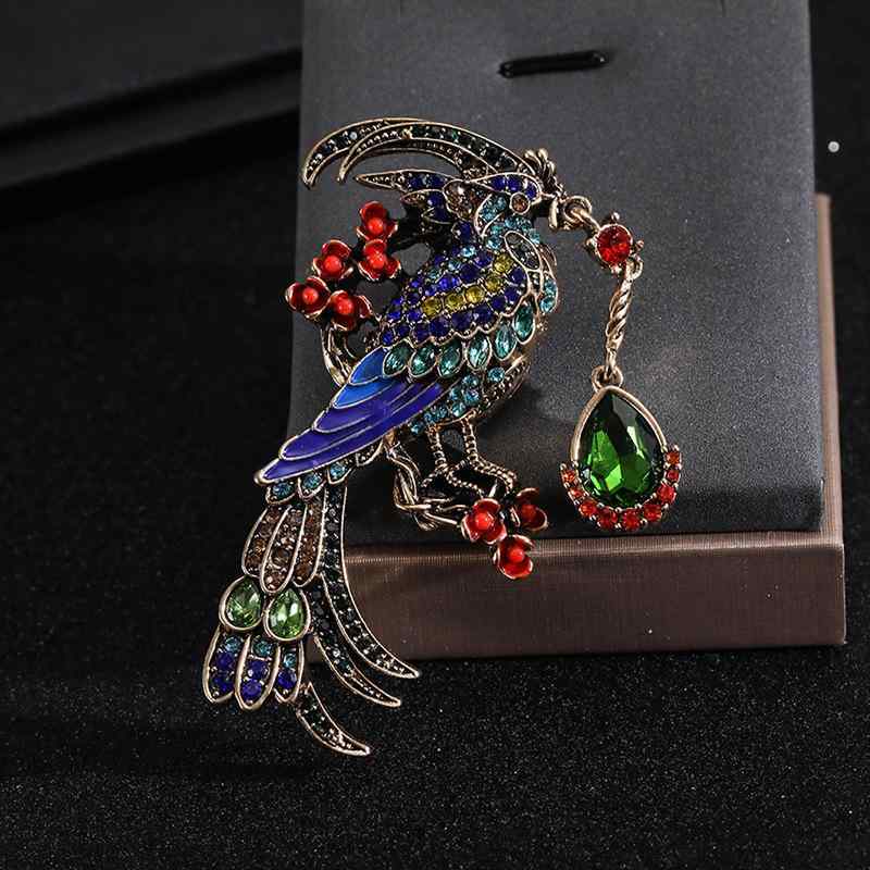 ブローチ メンズ レディース ユニセックス レトロ ヴィンテージ カラーストーン ラインストーン 鳥 フェニックス クジャク 動物 モチーフ 華やか 輝き しずく ドロップ 2WAY ペンダントトップ ファッション小物