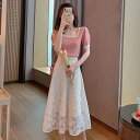 【送料無料】2点セット ツーピース トップス スカート デート レース カットソー フレアスカート ミモレ ミモレ丈 袖あり 半袖 スクエアネック 襟なし フレア Aライン 裾イン