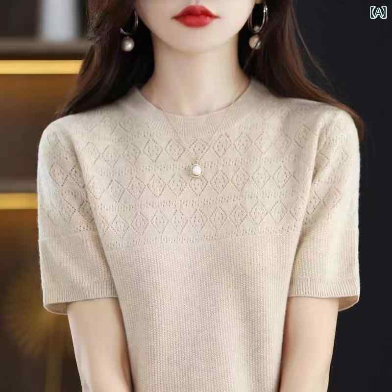 ベーシック トップス レディース ユニークな U ネックの ピンクの Tシャツ 女性用 夏 2025 美しい ウエストの ウール セーター 半袖 トップ