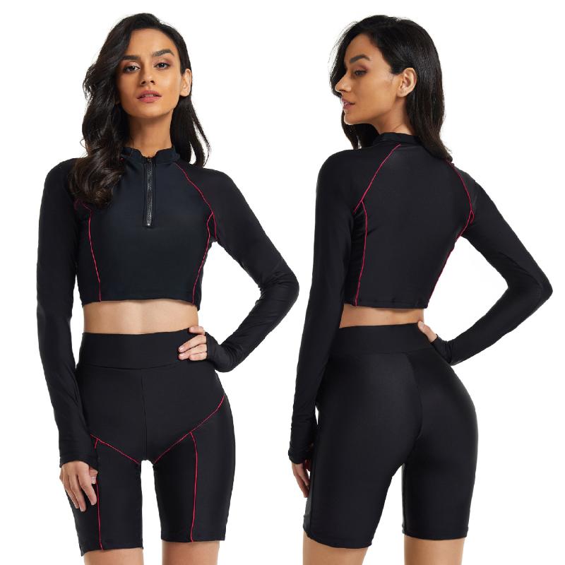 ・カテゴリ: スイムウェア・性別: 女性・対象年齢: 成人・スタイル: 無地、ハイウエスト、速乾、エコ、フィット、高伸縮性、高耐久性、欧米スタイル、ベーシック・カップ: 胸パッド付き、ノンワイヤー・主な素材: ナイロン82%・重さ: 約200g・裏地素材: ナイロン82%・適用シーン: ランニング、フィットネス、ボディメイク、スポーツトレンド、サイクリング、エクストリームスポーツ、ハイキング、登山、キャンプ、ダンス、球技(サッカー、バスケットボール、バレーボール、卓球、バドミントン、テニス)、釣り、水泳、ウォータースポーツ・カラー展開: ブラック・サイズ展開: S、M、L、XL、XXL・袖丈: 長袖・ボトムスタイル: 三角ショーツ
