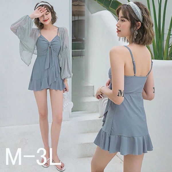水着 服みたいな レディース 体型カバー ワンピース水着 リボン チラ見え グレー 大人カラー フリル トップス付き カーディガン 長袖 露出控え パッド付 大きいサイズ 海 プール 旅行 温泉 かわいい セクシー 韓国風 大人 女性用 db037zezet2