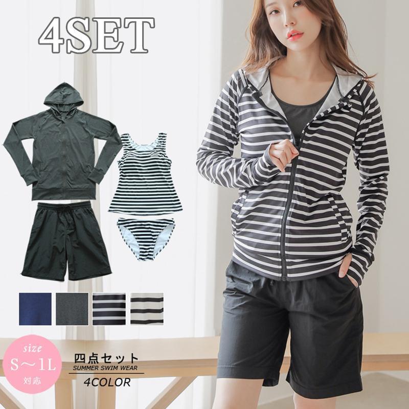 【限定販売!1着半額!まとめ買い2枚購入割引クーポン利用で! 】防水袋無料贈呈水着 レディース 体型カバー タンキニ 4点セット ラッシュT 半袖 ラッシュガード ショートパンツ 無地 エスニック かわいい ママ
