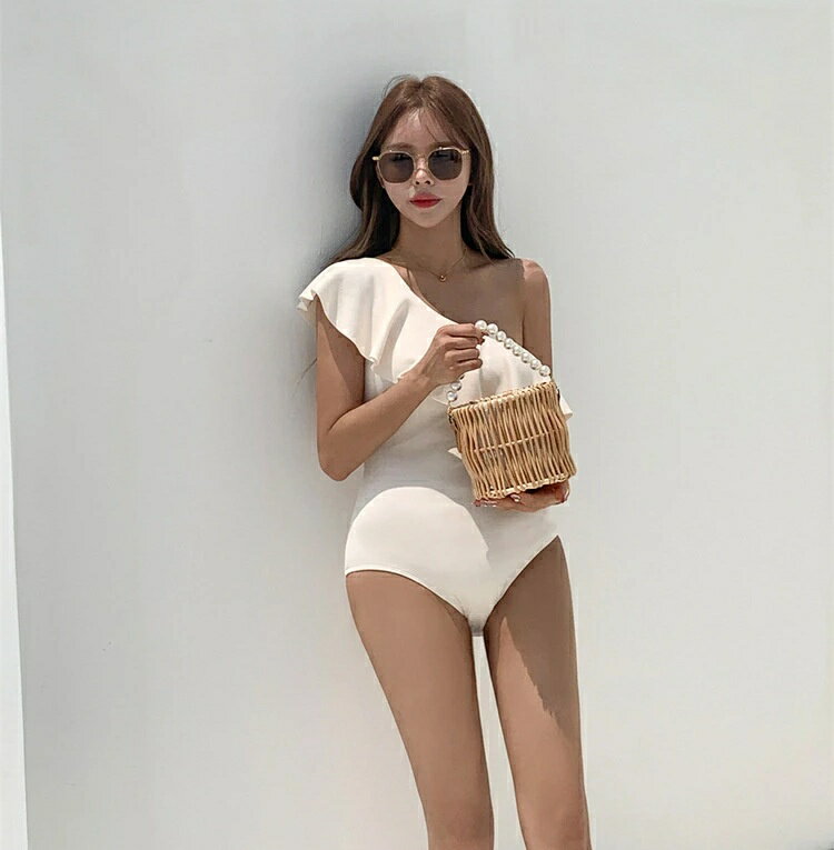 水着 レディース ワンピース オールインワン ワンショルダー 体型カバー フリル セクシー エレガント シンプル 無地 韓国 オトナ女子 パッド付き バスト 盛れる お腹 お尻 カバーアップ 夏 海