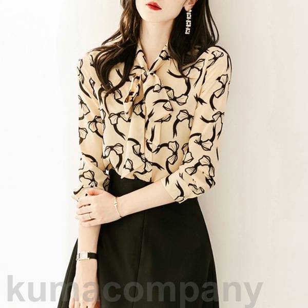 トップス ボウタイ ブラウス シャツ シルク混 リボン プリント エレガント レディース きれいめ カジュアル おしゃれ 長袖 大人 可愛い フェミニン クラシカル かっこいい 通勤 オフィス 体型カバー ベージュ 春 秋 夏 20代