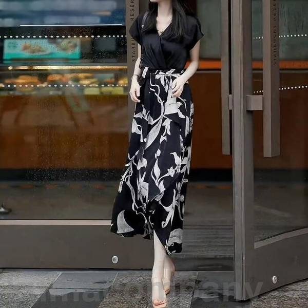 ワンピース ドレス シルク混 袖あり セパレート風 切替 ドッキング エレガント レディース きれいめ カジュアル おしゃれ 半袖 花柄 大人 可愛い フェミニン ミモレ丈 ハイウエスト フラワー 通勤 オフィス ブラック 黒 春 秋 夏 20代 30代 40代 50代