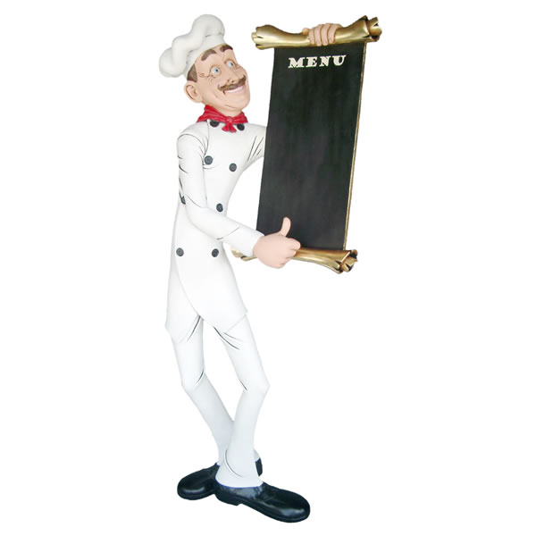 FRPオブジェ メニューを案内する細身のシェフ【即納可】置物 人物 人形 料理人 キッチン 飲食店 店舗 イベント ディスプレイ 実物大 等身大 リアル 等身大フィギュア