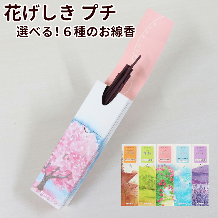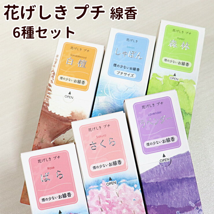 全6種の香りの「花げしきプチ」は、季節や気分によって香りいろいろ試せるプチサイズのお線香。 気軽に試せる内容量40gで試し買いしやすいプチプライスです。 さくら、ばら、ラベンダー、しゃぼん、森林、白檀の6種類から季節や気分にあわせて選んでみてくださいね。 サッと取り出しやすいスマートボックスで、置き場所を選ばないスリムサイズなので、小さなお仏壇の横にもピッタリ。 花げしきプチ6種セット の商品ページはこちら! お届け内容 花げしき プチ 内容量:40g 燃焼時間:25分 商品サイズ 箱:横4cm×奥3cm×高さ14.4cm 長さ:13.5cm 注意事項 ・燃焼中はそばを離れないでください。 ・カビ変色等を防ぐため直射日光、高温多湿を避けて保管してください。 ・ペットちゃんや小さなお子様やペットちゃんがいるご家庭では十分に気をつけてお使いください。 ・ご使用前に必ずパッケージ側面の説明をお読みください。 お線香をもっと気軽に試して欲しいとの思いから生まれた「花げしき プチ」は、40gの少量線香です。 コンパクトなパッケージですので収納や置き場もえらびません。 バリエーションも豊富なので季節や気分で香りをお供えするのもよいかもしれませんね。 ペット仏壇仏具虹の架け橋kobe