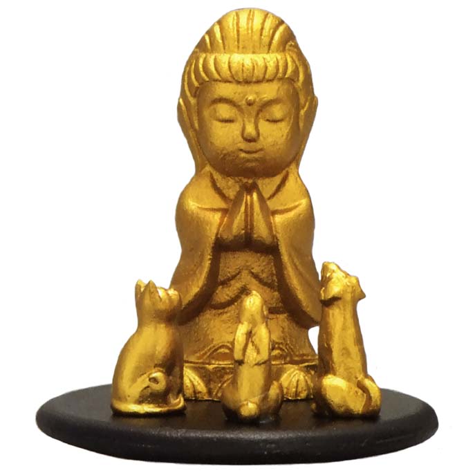ペット供養の観音様です。 ペット供養仏としては最小さい高さ5.8cmタイプです。 観音様の足元では動物たち(犬、猫、うさぎ)が 観音様を見上げています。 製品は富山県高岡市で生産されている高岡銅器です。 ・その他の種類の供養仏・掛軸は こちら ・本品の厨子入りタイプは こちら 全高58mm横幅53mm奥行53mm材質合金製色金色