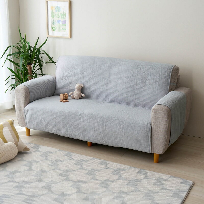 グレイッシュベージュ ※色参考用画像となります ライトグレー ※色参考用画像となります ◆◆ さっと付け外しできて、洗いやすいソファーカバー ◆◆ ーデザイン・スタイリングー ・汚れたり傷みやすい肘掛け部分まで、しっかりと覆えるサイズ ・お部屋になじむナチュラルな色合い ー素材ー ・さらさらでふんわりとしたイブル素材 ・綿に洗いをかけることで、よりやさしい風合いに ・こまかく入れたキルトがほどよいクッション性を発揮 ー機能ー ・洗濯機で気軽に洗えるのでいつも清潔に ・適応ソファーサイズ/イラスト参照 ・品質/表地:綿100%、裏地:ポリエステル80%、綿20%、中わた:ポリエステル100% ・製品洗い加工 ・中国製 ※洗濯機をご使用の際は、洗濯ネットをご使用ください。 >2人掛けサイズはこちら >3人掛けサイズはこちら >3人掛けワイドサイズはこちら