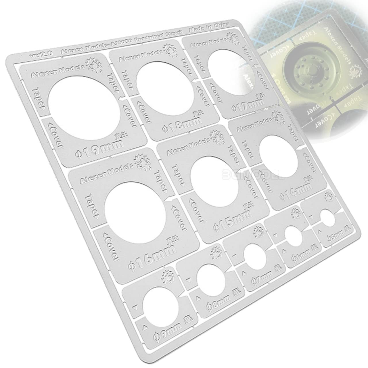 商品情報商品の説明主な仕様 AFV(装甲戦闘車両)のタイヤやホイール部分の塗装をキレイに仕上げてくれる画期的アイテム!マスキングテンプレートのご紹介です。 精密で繊細な作業といわれるホイール部の塗装ですが、このアイテムを使うことで、難しい作業をしっかりアシスト! さまざまな直径のテンプレートがあるので、対象物に合わせて、塗りたいパーツの塗りムラも防ぎます。 車輪のマスキングに特化したこのツールで大満足の仕上がりに!ぜひお試しください!brAFVのタイヤや、車輪のホイール部分を塗装しようとすると、通常はタイヤ部分にマスキングテープをきれいに円形に貼り付けるなど、細かくて丁寧な作業を経る必要があります。 時間もかかり、なかなか初心者にはハードルの高い工程。 そんな難しい作業をアシストしてくれる、車輪のマスキングに特化したテンプレートになっています。 時短に繋がり、楽しくスムーズに塗装ができて、あなたをアシストしてくれる大活躍なアイテムです。主に現用AFV車両(戦車、自走砲、装甲車等)向けになっています。 円の直径は、5mmから9mmまでと、14mmから19mmまで、それぞれ1mm刻みで合計11種用意されています。 様々な直径のテンプレートとなっているので、塗りたいパーツに合わせやすく、塗りムラも防いでくれます。 素材はステンレス製で、耐性が高く、そのうえ防錆効果にも優れているので、このマスキングテンプレート1つあれば長くご活用いただけます。主に現用AFV車両(戦車、自走砲、装甲車等)向け、車輪のマスキングに特化したマスキングテンプレートです。 車輪のホイールを塗装する時に、通常ならタイヤ部分に、円形にマスキングテープを貼って塗装がかからないようにする工程が必要になります。 時間もかかり、細かく難しい作業されていますが、このテンプレートを使うことで、どなたでもスムーズに塗装ができるようにしっかりアシストします! あなたの趣味の時間がより快適になりますね。サイズ:8,2cm×8,2cm 素材:ステンレス 重さ:7g 円の直径:5mm、6mm、7mm、8mm、9mm、14mm、15mm、16mm、17mm、18mm、19mm