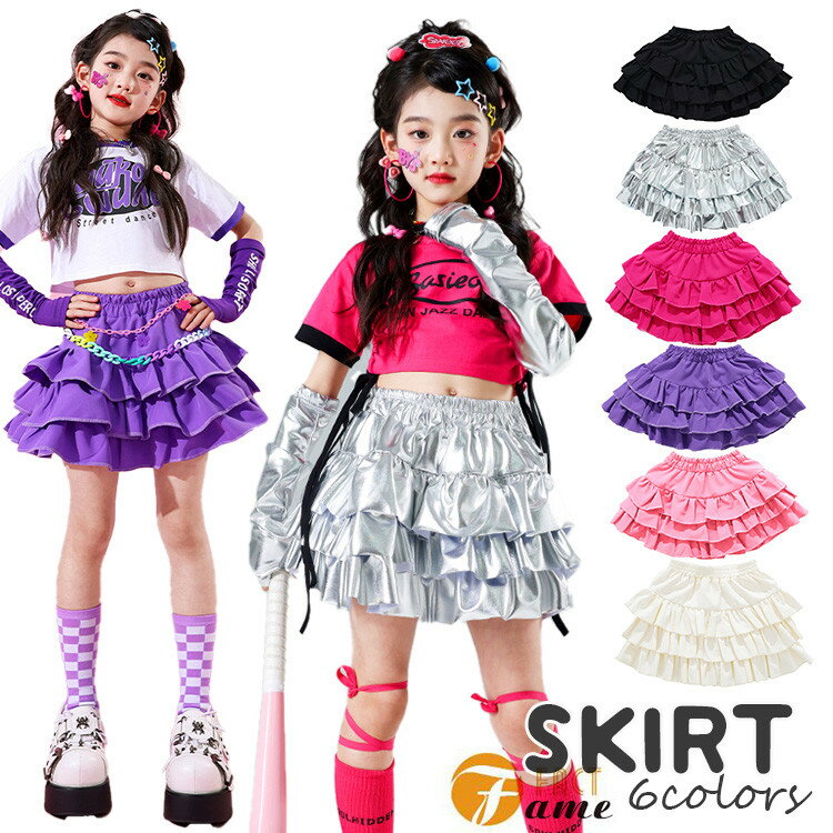 女の子 ダンス衣装 ミニスカート ヒップホップ フリル スカート 3段 ピンク ローズ 黒 シルバー 紫 白 可愛い ミニスカ 小学生 中学生 カラフル スカート ガール チアガール jazz K-POP オシャレ 練習 団体服 応援団 発表会 110-170