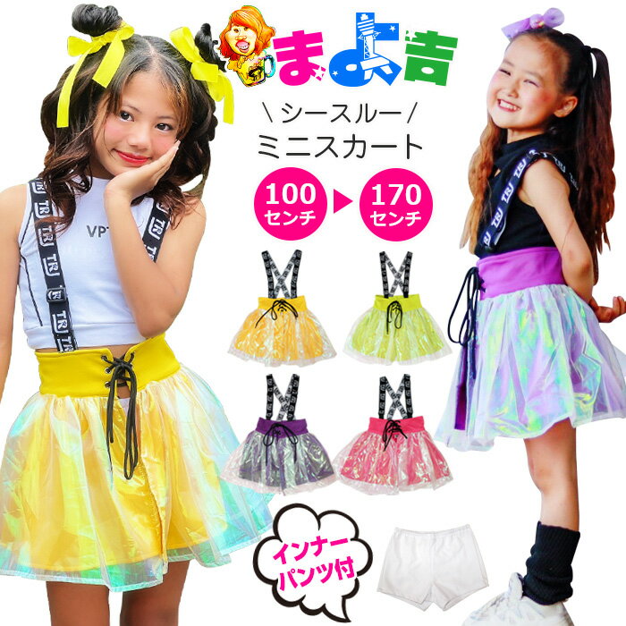 サスペンダースカート 巻きスカート 前開きスカート 女の子 子供服 キッズ ロゴ イエロー パープル ネオングリーン ピンク 110cm〜170cm ダンス衣装 ヒップホップダンス チア スカート チアガール チュール ミニスカ 編み上げリボン ステージ衣装 サロペット シースルー