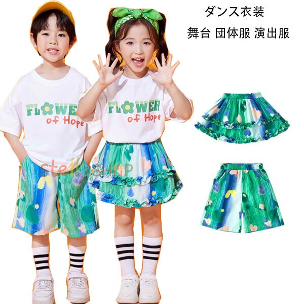 キッズダンス グリーン スカート ショーツ 幼稚園 小学校 学生 ダンスウェア 撮影写真 パーティー 女の子/ショートスカート 男の子/ショートパンツ 体育祭 文化祭 学園祭 クラス活動 子供ダンス オシャレ hiphop K-pop ステージ衣装 jazz 原宿系 100-170