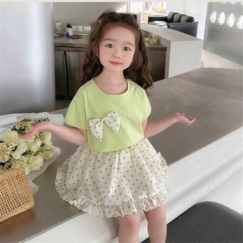 ワンピース キッズ 女の子 子供服 上下セット 半袖 Tシャツ 水玉 ドット柄 スカート 2点セット かわいい 夏 薄手 接触冷感 プリンセス おしゃれ お出かけ 普段着 オレンジ グリーン系 90 100 110 120 130