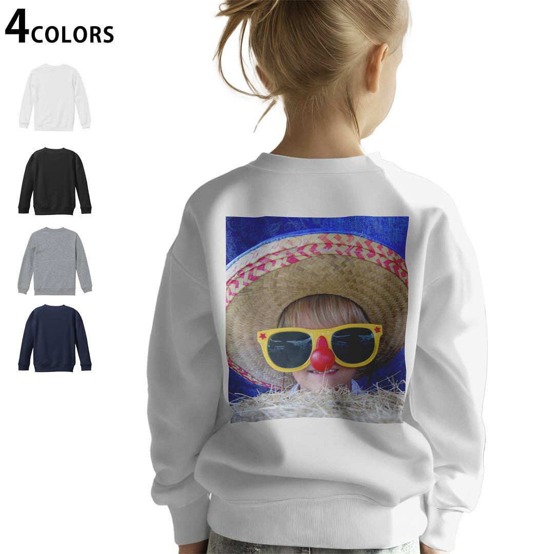 選べる3カラー バックプリント スウェットレーナー キッズ 男女兼用 男の子 女の子 ユニセックス unisex 長袖 デザイン リブ ホワイト ブラック 白 黒 グレー ネイビー 110 130 150 trainer sweat 023380 人物 ピエロ サングラス