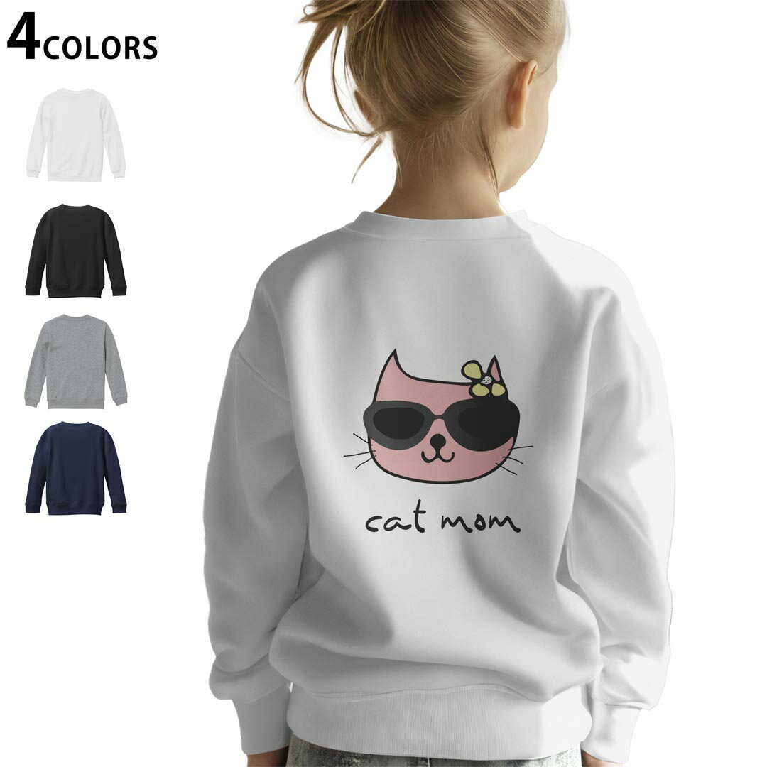 選べる3カラー バックプリント スウェットレーナー キッズ 男女兼用 男の子 女の子 ユニセックス unisex 長袖 デザイン リブ ホワイト ブラック 白 黒 グレー ネイビー 110 130 150 trainer sweat 026174 動物 ネコ 猫 サングラス