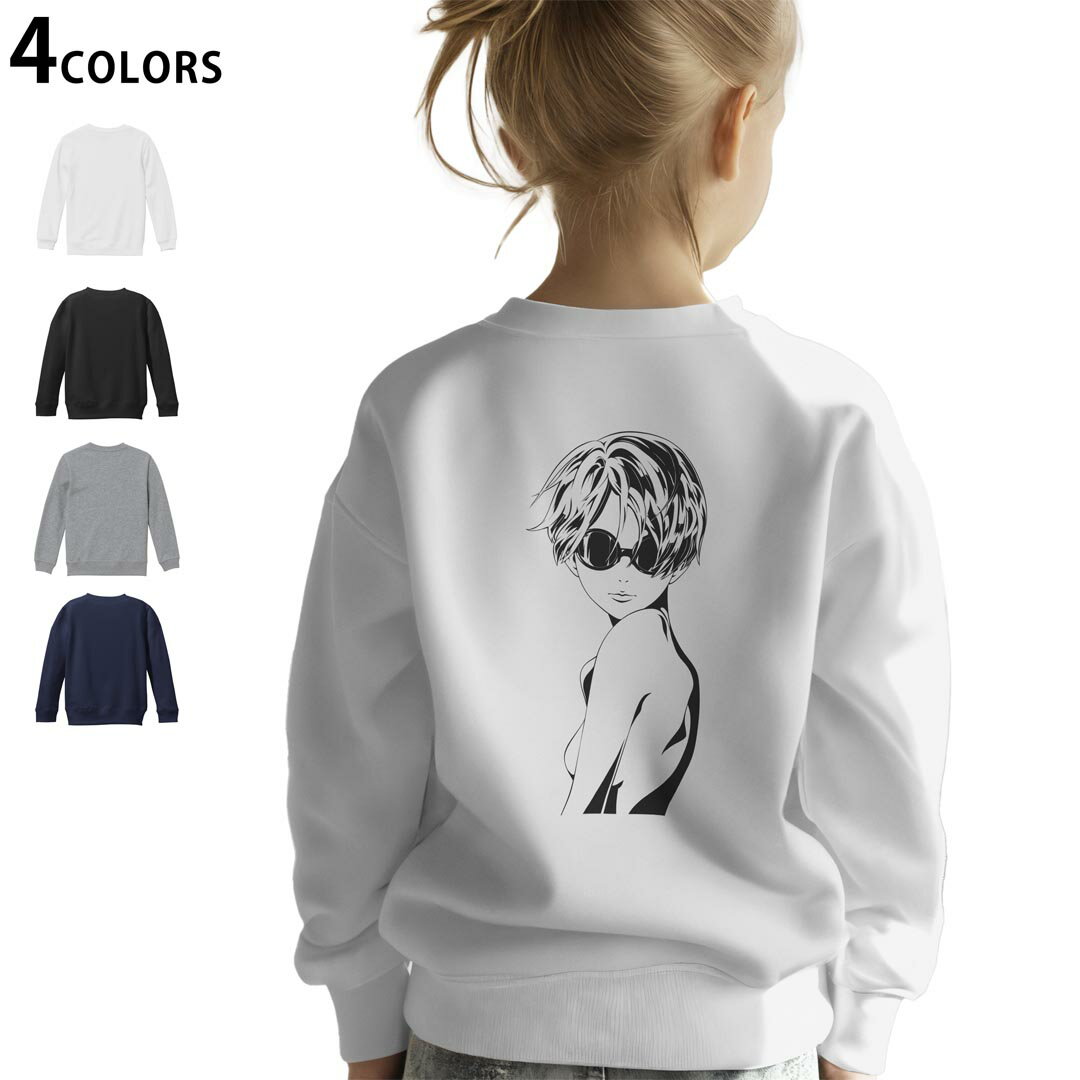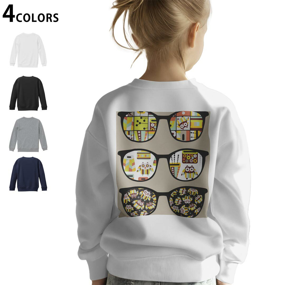 選べる3カラー バックプリント スウェットレーナー キッズ 男女兼用 男の子 女の子 ユニセックス unisex 長袖 デザイン リブ ホワイト ブラック 白 黒 グレー ネイビー 110 130 150 trainer sweat 004771 眼鏡 サングラス イラスト