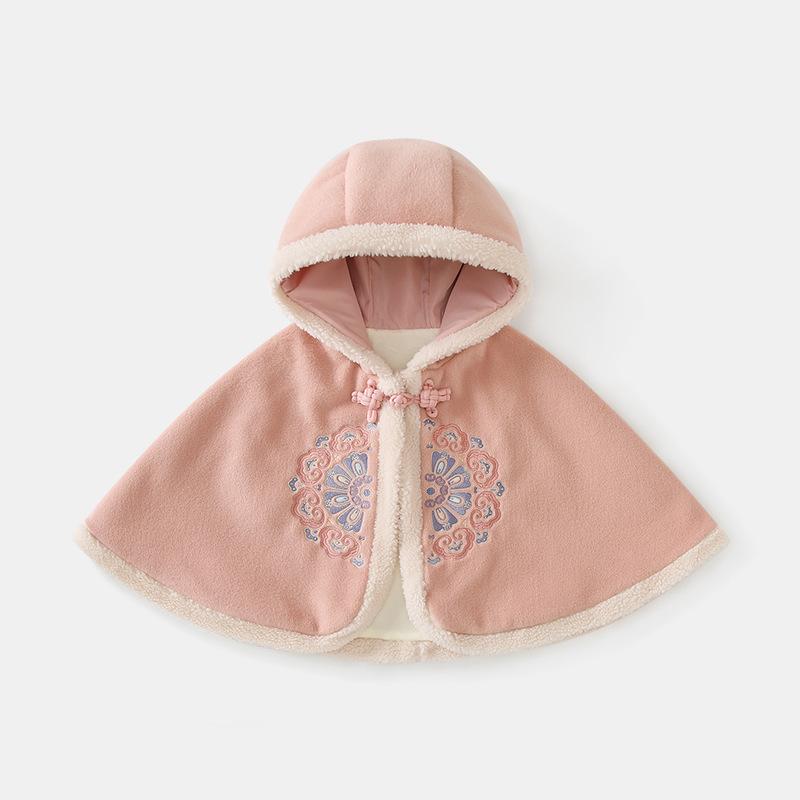 ケープ ベビー 女の子 新生児 フード付き 秋冬 厚手 裏起毛 防風 お出かけ ポンチョ マント 中国風 ショール ポリエステル ワンボタン ピンク系 アウター 防寒着 普段使い