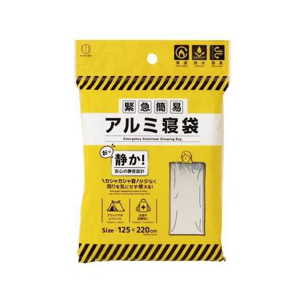 緊急アルミ寝袋です。カシャカシャ音が少なく避難先でも周りを気にせず使えます。アルミの保温効果で温かく急な冷え込みにも安心です。携帯に便利なコンパクトサイズです。※リニューアルにより写真以外のパッケージやデザイン、色、サイズ、種類になる場合有り●サイズ(約)・1250×2200mm●材質・アルミニウム 低密度ポリエチレン●用途・寝袋 アルミ 防寒 災害 レジャー アウトドア●キーワード・ねぶくろ あるみ ぼうかん さいがい れじゃー あうとどあ●シリーズ名・緊急簡易●品名・緊急簡易アルミ寝袋 静音タイプ●品番・★5995●JAN・4956810959952●メーカー名・(株)小久保工業所●管理単位・10個/100個●入数・1枚