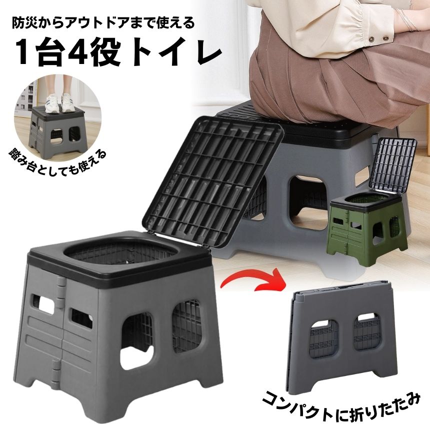 【折り畳み式&超・軽量&携帯便利】 本体を広げ便座を取り付けるだけの折り畳み式の簡易トイレです。数秒で簡単に組み立て・折りたたみが可能です。わずか1.4kgでとても軽くて持ち運びしやすいポータブルトイレです。【耐荷重150kg&水洗いOK!】 コンパクトサイズなのに耐荷重150kg!子供から大人まで簡単にご利用いただけます。プラスチック製で丸ごと水洗いができますので、つねに清潔な状態をキープできます。汚れの心配も必要なし、非常時でもストレスフリーで使用できます。【フタ付きタイプ&1台4役】 フタが付いているタイプなので、災害時や断水などの非常時は簡易トイレとしてご利用頂けるだけでなく、イス/踏み台/ゴミ箱としても使用できます。自宅やアウトドアや車載など様々なシーンで活躍しています。災害時の自宅の断水対策やお出かけ時の非常用用トイレとしても最適です。【携帯性の高い】携帯用のハンドルが付いており、持ち運びが非常に便利です。アウトドアでキャンプや旅行、または車内で使用する場合でも、トイレの問題を簡単に解決できます。特に、緊急災害や停電の場合でも、トイレの心配することもありません。【多機能な設計】スツールやゴミ箱など、キッチン、玄関、アウトドアなどの場所で日常的に使用することができます。実用的で緊急時以外でも大活躍。折り畳み式の簡易トイレ。軽く丈夫、その上見た目もスタイリッシュ。キャンプやアウトドア、レジャー、非常用、介護用、車中泊や渋滞に備えて車に常備のコンテナとしてなど。いざという時に役にたつポータブルトイレとなります。PPなので丸洗い出来て、衛生面でも安心◎防災グッズとしても持っておいて損はありません。■送料無料■※北海道は330円UP、離島地域及び沖縄県は950円UPにて承ります。