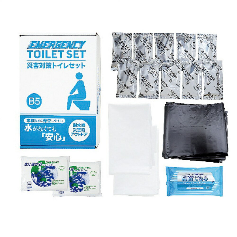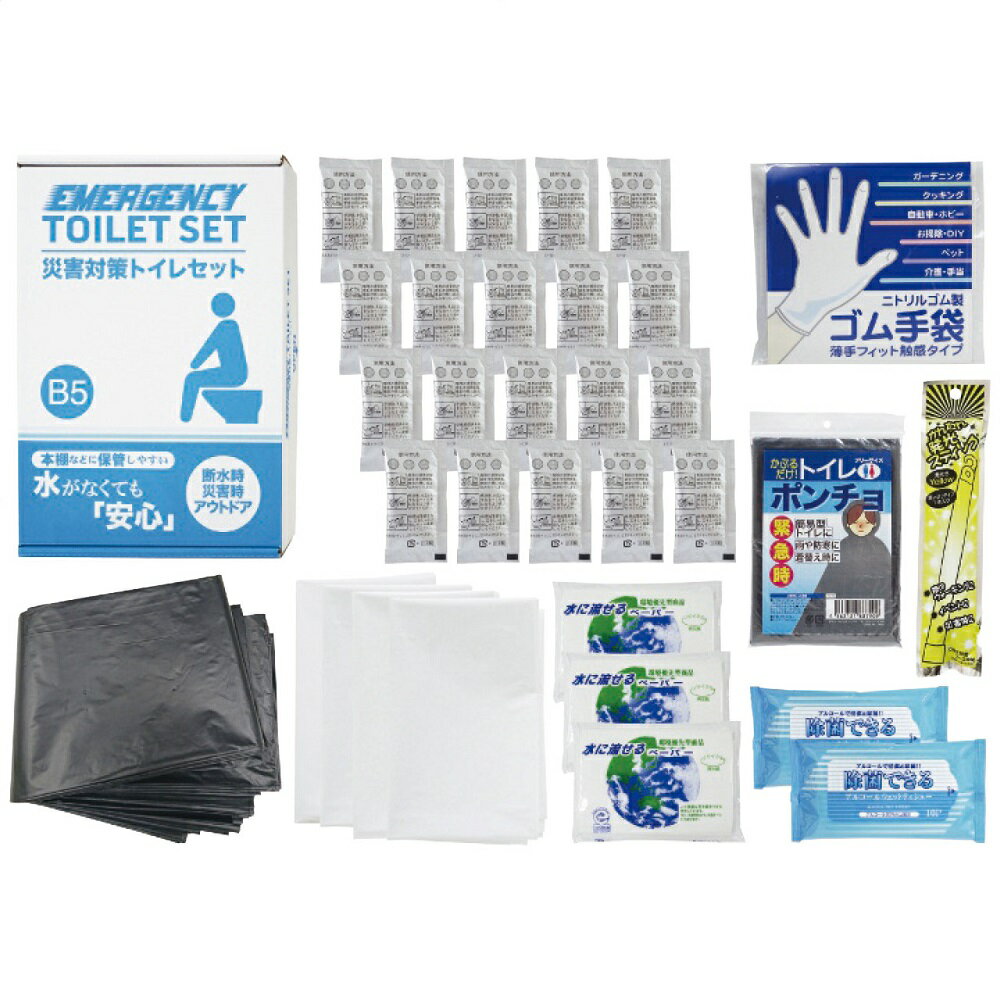 災害対策トイレセット(10回分プラス) MT-25RB5ファイルボックスサイズの箱入りで棚や引き出しにコンパクトに備蓄可能。水がなくてトイレが使えない時にも便座に袋をセットし、使用するだけで簡単に排泄処理ができます。処理後は可燃物として廃棄可能。■セット内容:吸収性凝固剤10個・排便処理袋10枚・収納外袋2枚・水に流せるペーパー2個・除菌アルコールウェットティッシュ・発光スティック・トイレポンチョ・ゴム手袋各1個■製造生産地:日本・中国・タイ・マレーシア製■箱サイズ:約6×19×27.8cm ご注文の前に※商品ページ内の「メーカー直送品につきまして」の画像を必ずご確認下さい。・メーカー都合によりラベルデザイン・仕様(量目等)変更する場合がございます。・メーカー直送の為、配送方法の指定が不可となります。ご注文後、配送方法が変更になる場合もございますので、予めご了承の程よろしくお願いいたします。※当店からご注文内容についてご連絡を行う場合がございます。必ずメールやお電話のご確認をお願いいたします。●さまざまなギフトアイテムをご用意しております。 各種御祝い、内祝いギフト カタログ カタログギフト 贈り物 御礼 内祝い 今治タオル おしゃれ 御祝 内祝 出産内祝い お祝い 御祝い お礼 謝礼 御返し お返し 結婚内祝い 快気祝 退院祝い 快気内祝 開店祝い 御中元 お中元 お歳暮 お年賀 プレゼント 母の日 父の日 敬老の日 クリスマス 暑中御見舞 残暑御見舞 御見舞 御歳暮 御年賀 寒中御見舞 合格祝い 開院祝い 進学内祝い 御成人御祝 新年会 卒業記念品 卒業祝い ギフトカタログ グルメカタログ グルメギフト 御卒業御祝 成人式 入学祝い 入学内祝い 就職祝い 入園内祝い 御入園御祝 金婚式御祝 銀婚式御祝 御結婚お祝い ご結婚御祝い 御開店祝 御結婚御祝 結婚祝い 法事引出物 結婚式 引き出物 景品 お祝い返し バレンタイン 引出物 贈答品 粗品 引き菓子 御出産御祝 ご出産御祝い 出産御祝 出産祝い 御新築祝 新築御祝 新築内祝い 祝御新築 祝御誕生日 誕生日祝 七五三御祝 ひなまつり ホワイトデー 初節句御祝 節句 昇進祝い 昇格祝い 就任 お供え物 香典返し 志 粗供養 一周忌 三回忌 七回忌 十三回忌 十七回忌 二十三回忌 二十七回忌 御供 手土産 寸志 御仏前 御佛前 御霊前 進物 粗供養 偲草 偲び草 四十九日 七七日 忌明け 法要 仏事 法事引き出物 法事 年回忌法要 開店祝 開店御祝い 開店お祝い 御開業祝 周年記念 来客 お茶請け 御茶請け 異動 転勤 定年 退職 お餞別 粗菓 菓子折り 新歓 歓迎会 送迎会 忘年会 二次会 記念品 福袋 御見舞御礼 快気祝い 快気内祝い お土産 プチギフト 全快祝い 御挨拶 ごあいさつ 引越し バレンタインデー ご挨拶 引っ越し お宮参り 御年始 初盆 お盆 お彼岸 残暑見舞い 寒中お見舞 金婚式 銀婚式 ダイヤモンド婚式 長寿祝い 還暦祝 古稀祝い 喜寿祝い 傘寿祝い 米寿祝い 卒寿祝い 白寿祝い のし無料 ラッピング無料 メッセージカード無料 大量注文賜ります