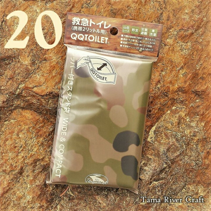商品説明商品名救急トイレ QQTOILET(WIPO国際商標登録No,1263688)数量20個入りサイズ 携行サイズ 横8cm×縦12cm×厚1.5cm使用サイズ 横36cm×縦17cm×幅16cm 材質厚み/112ミクロン PET#12/ドライラミネート /ポリエチレン/アルミ蒸着処理色 迷彩柄重さ 42g/1個密封力Wジッパー式/密封力は、鉛直耐荷重値試験で1918N(195kgf)迄密封力を保持セット品 スタンドチャック袋水溶性ポケットティッシュ375GEL(し尿凝固剤) 商品説明 携帯用迷彩QQトイレは、本格的なアウトドアー仕様で、水溶性ティッシュと凝固剤を3点セットにした42gのプロフェッショナルモデル。携行時は極小サイズ、使用時はビッグサイズで使用する。 本体の側面及び底面に自衛隊仕様の迷彩色を施したデザインは、更に艶消しラミネートがコーティングされ、好評である。 トイレ以外でも、生ごみから2ℓの給水容器として、また、床に置いても、袋そのものが自立する構造は、他社製品にはない、卓越した多機能性が特徴といえる。 登山等で使用した場合、「375ジェル(高分子ポリマー)」で、一旦し尿を凝固させ、さらに強力な密封力195kgfのWジッパー付き容器で内容物を漏らさない。 下山した後は、紙おむつと同様に一般ごみとして回収し焼却。(ダイオキシンは発生しない)その他日本南極地域観測隊調達品 / 防衛装備庁選定品 / 生活協同組合 等高品質 "迷彩柄"〈日本製〉救急トイレスポーツ|旅行 |山歩き|防災用品"携帯トイレ" 3点付セット 便器 | ティッシュ | 凝固剤★自立する便器(Wチャック付)"迷彩色"のトイレ人目につかない一滴も漏れない"無臭"耐圧195kg"サバイバル"緊急|アウトドアグッズ"抗菌"アルミ処理大便|小便|男女共用袋が自立"倒れない"両手を離して使える衛生的に"焼却"ジッパー付|使い捨て★凝固剤(375GEL)屎尿を固める"凝固剤"水3.75リットルを凝固"経済的"な11g入り防水|節約|保管用約1000倍の水分が"ゼリー状"に固まる震災|水害|洪水|避難所で汚物を衛生的に焼却できる、おすすめの防災グッズ※凝固剤の保存期間は約10年★水溶性ポケットティッシュ20cm四方サイズ|2枚重ね紙|6枚入り。肌触りが良く"水に溶ける"天然素材使用、山歩き|トレイルラン|スポーツなど日常から災害まで環境を守ります。
