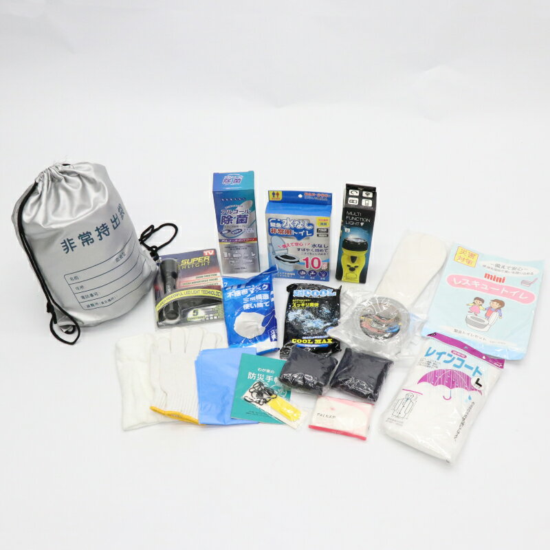 【セット内容】 ■アルコールジェル ■非常用トイレ※パッケージ変更あり ■レスキュートイレ ■プラスチック手袋 ■マスク ■軍手 ■使い捨てスリッパ ■タオル ■除菌ウェットシート ■ボディシート ■ウォータータンク ■救急セット ■ビニール袋 ■レインコート ■使い捨てパンツ×4 ■笛 ■ポケクリン ■LEDライト ■アルミガラステープ ■防災手帳 ■レスキューシート ■防災ウェットシート ■ポケットティッシュ×2