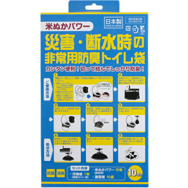 商品名 災害・断水時の非常用防臭トイレ袋 10回分 商品特徴 もしものときに備えておけば安心! 災害・断水時で水や電気がなくてもトイレが使えます。 すぐに固まる凝固剤、米ぬかパワーの抗菌・消臭力で排泄後の処理も安心です。 袋の口を外側に折れば簡単に和式トイレが作れます。 ●凝固剤:1回分の尿を固めます。尿の吸水目安は約500mlです。排泄前にふりかけてもご使用頂けます。(成人の1回の尿量は約200~400mlです。) 商品仕様 【サイズ(約)】 汚物袋:65×80cm 米ぬかパワー:65×50cm 凝固剤:6×8cm 【材質】 汚物袋(便器カバー):ポリエチレン 米ぬかパワー(排泄用):ポリエチレン 凝固剤:高吸水性樹脂 【セット内容】汚物袋(便器カバー用)×1枚、米ぬかパワー(排泄用)×10枚、凝固剤×10袋 【生産地】日本 【ブランド】丸真化学工業 【関連キーワード】災害・断水時の非常用防臭トイレ袋 10回分 携帯トイレ 簡易トイレ 10枚セット 緊急トイレ 防災 セット 非常用 男性 女性 携帯用トイレ 非常用トイレ 大便 小便 男女兼用 介護 使い切り 使い捨て 防災対策 台風 災害 断水 地震 アウトドア ドライブ 車 防災セット 防災グッズ 非常用トイレセット グッズ おすすめ 人気 通販 販売